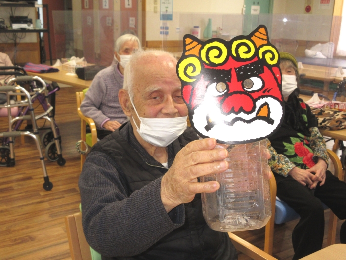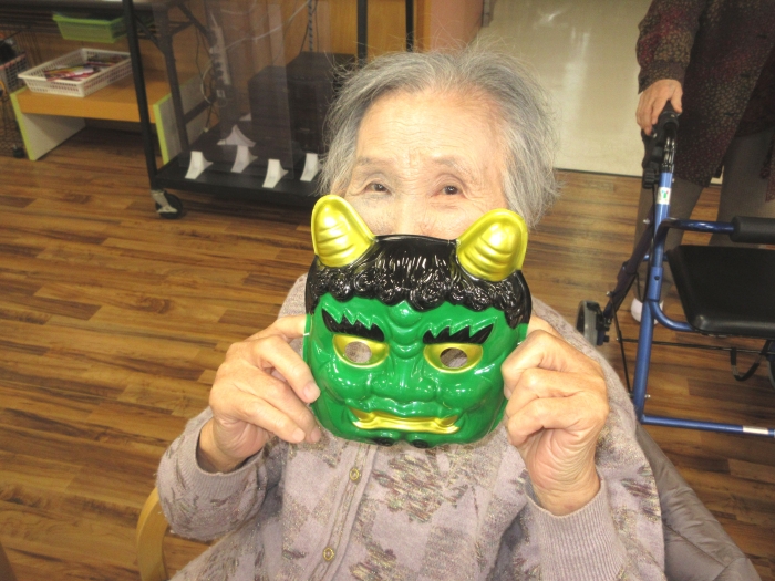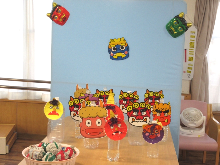 2日間にわたり、利用者の皆さんには節分鬼退治ゲームを行っていただきました。お手製の13体の鬼を、豆に見立てた新聞紙の球で倒します。皆さんとても集中されており、たくさんの鬼を退治していました。ほかの利用者さんからの熱い応援もあり、楽しい雰囲気で過ごすことができました。