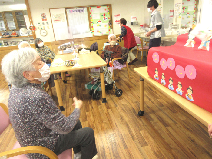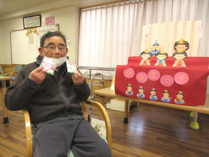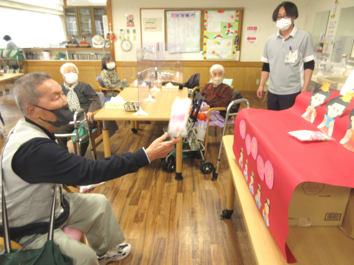 ひな祭りにちなみ、ひなあられのお菓子の入った袋を投げて、上手くひな壇に乗せていただくレクリエーションを行いました。お菓子のパックが軽くコントロールが難しかったようで、思いもよらぬ方向に飛んで行ってしまうこともあり、そのたびに周りの利用者さんたちから笑い声が起こり、参加者全員で盛り上がりました。