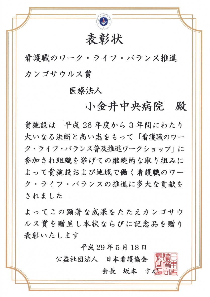 3年間の継続的な取り組みと、当院のWLB推進の成果に対して平成29年5月18日に公益社団法人日本看護協会より「看護職のワーク・ライフ・バランス推進 カンゴサウルス賞」を受賞しました。